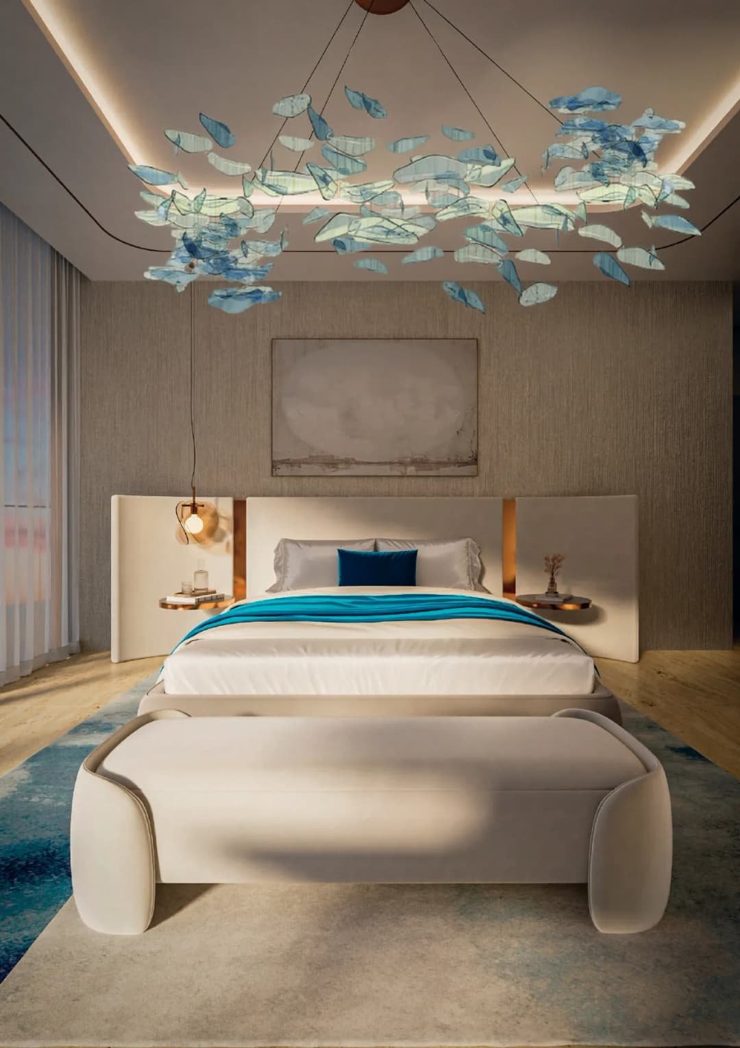 Interiors are designed in a contemporary coastal palette, emphasizing natural tones, expansive glazing, and seamless transitions between indoor and outdoor living. Living areas feature floor-to-ceiling windows and refined finishes that enhance light and openness. Kitchens are presented with sleek cabinetry, integrated appliances, and stone-effect worktops, maintaining a clean and sophisticated aesthetic. Bedrooms and bathrooms follow a restrained, elegant design language with premium fittings and carefully selected materials that align with the project’s understated luxury character.
